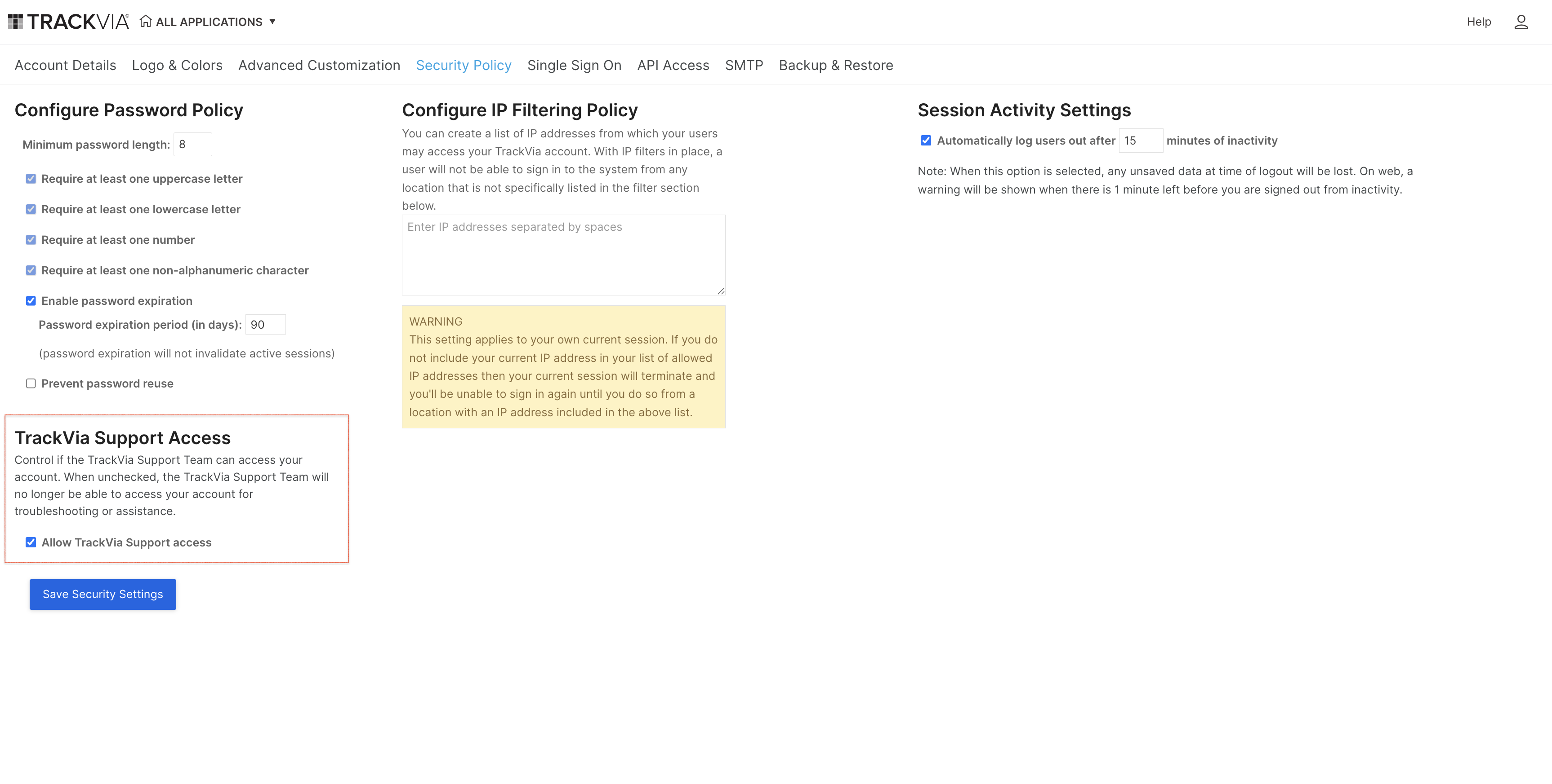 - 💡 Our Support teams love helping you understand and resolve issues in TrackVia, but some customers have strict policies related to account access. If you need to ensure that no internal TrackVia team members ever have access to your account without needing to deactivate individual support users, Super Admin can now easily uncheck the "TrackVia Support Access" checkbox in the 'Security Policy' section of your account's settings:
